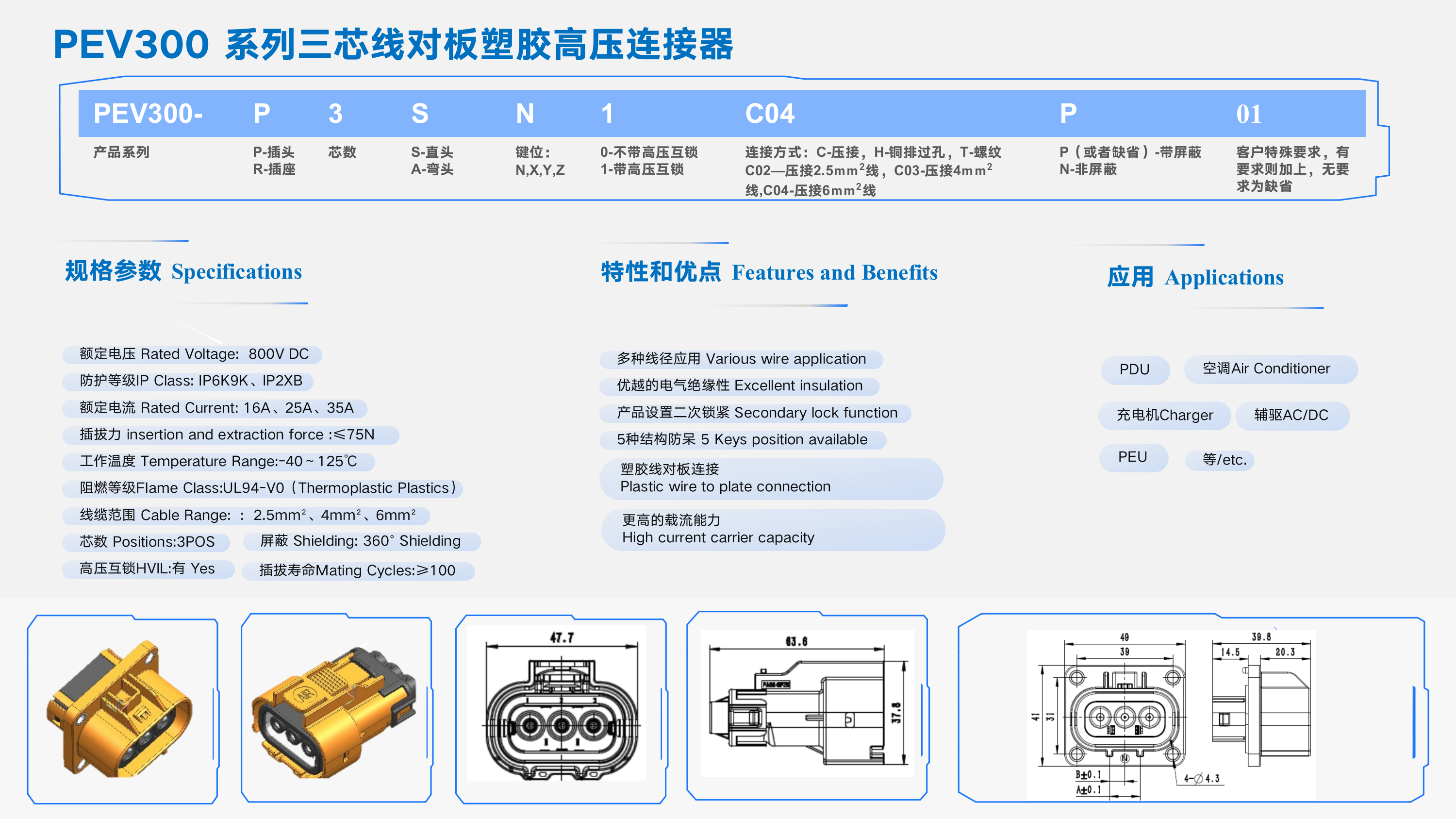 PEV300 系列三芯線(xiàn)對板塑膠高壓連接器