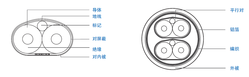 | 導體:28 AWG 單根鍍銀銅線(xiàn), 外徑0.35 mm | 半成品:2 對 (#1-2) 一起成纜 |